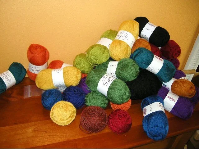 And what might be happening here, you ask? Why only the ball-winding preparations for my fabulous "Knitting Behind the Wheel" class, which I'm teaching on Sunday! All the students receive a kit containing 13 colors of yarn, a fun pattern to use them with, and their very own color wheel. In addition to how to use a color wheel (and why you might want to), students in this class learn how to work an applied knitted cord and make a Dorset button, too.