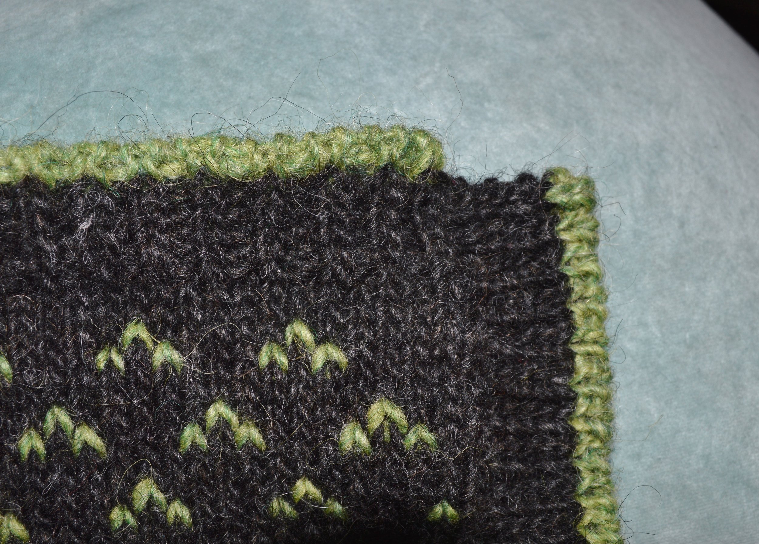 Then I execute whichever honorable and impressive bind-off maneuver I used for the rest of the edges. After that, I use the yarn tails to darn the "filler" edging to the previously-worked ones, if necessary, and Voila! Self-satisfied smugness is achieved. Fiddly? a bit. But preferable to brain fissures.