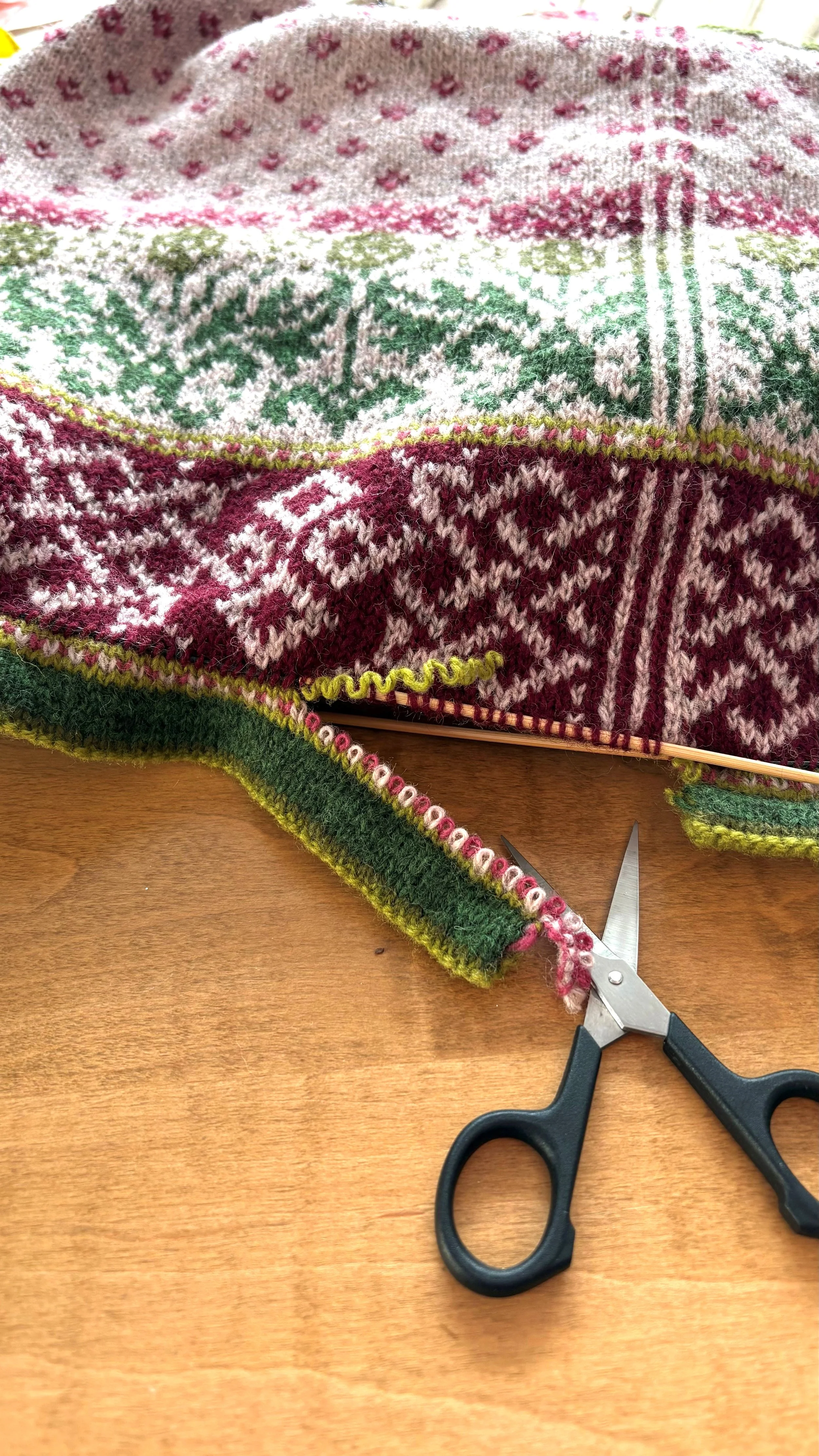Warning: This blog post contains graphic photos of sweater in progress being cut with scissors. Readers who don’t want to know how the sausage is made should maybe sit this one out.
