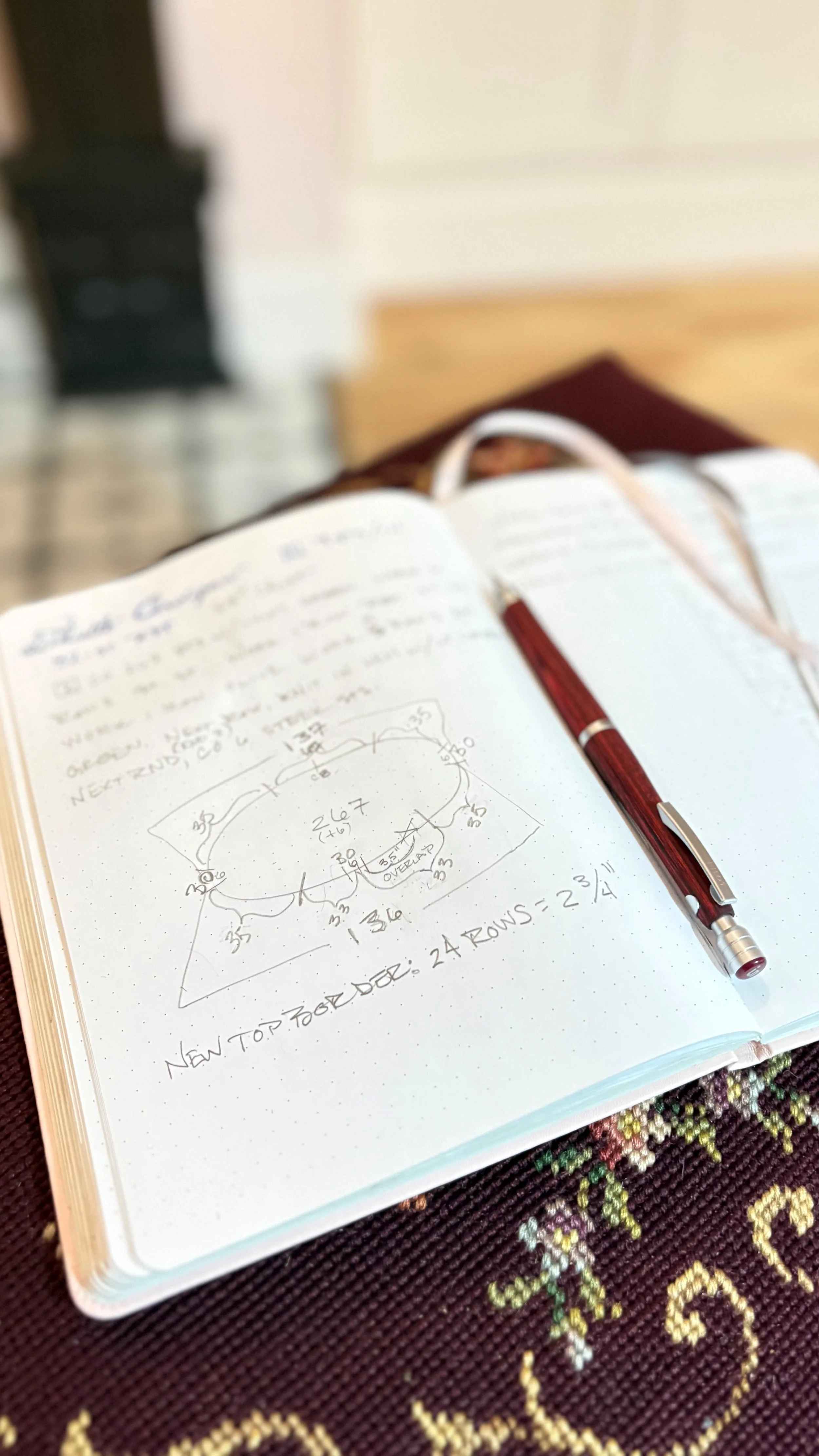 The rubber is starting to hit the road, here at Mary Elizabeth Scott Handknitter International Headquarters. As always, while I knit/design, I keep meticulous notes about what I’m doing, how I’m doing it, and what numbers are involved. Usually they are scary-looking, and unintelligeable to anyone but me. For example, the scribble below represents a cross-section of the sweater body tube, with the division of stitches called out for cutting. My loved ones refer to my notebook as evidence of a “beautiful mind”.