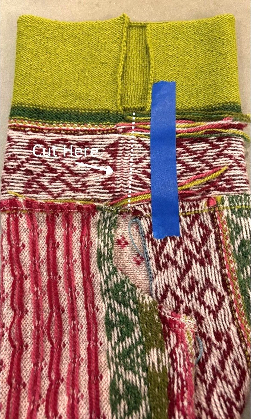 Warning: This blog post contains graphic photos of sweater in progress being cut with scissors. Readers who don’t want to know how the sausage is made should maybe sit this one out.