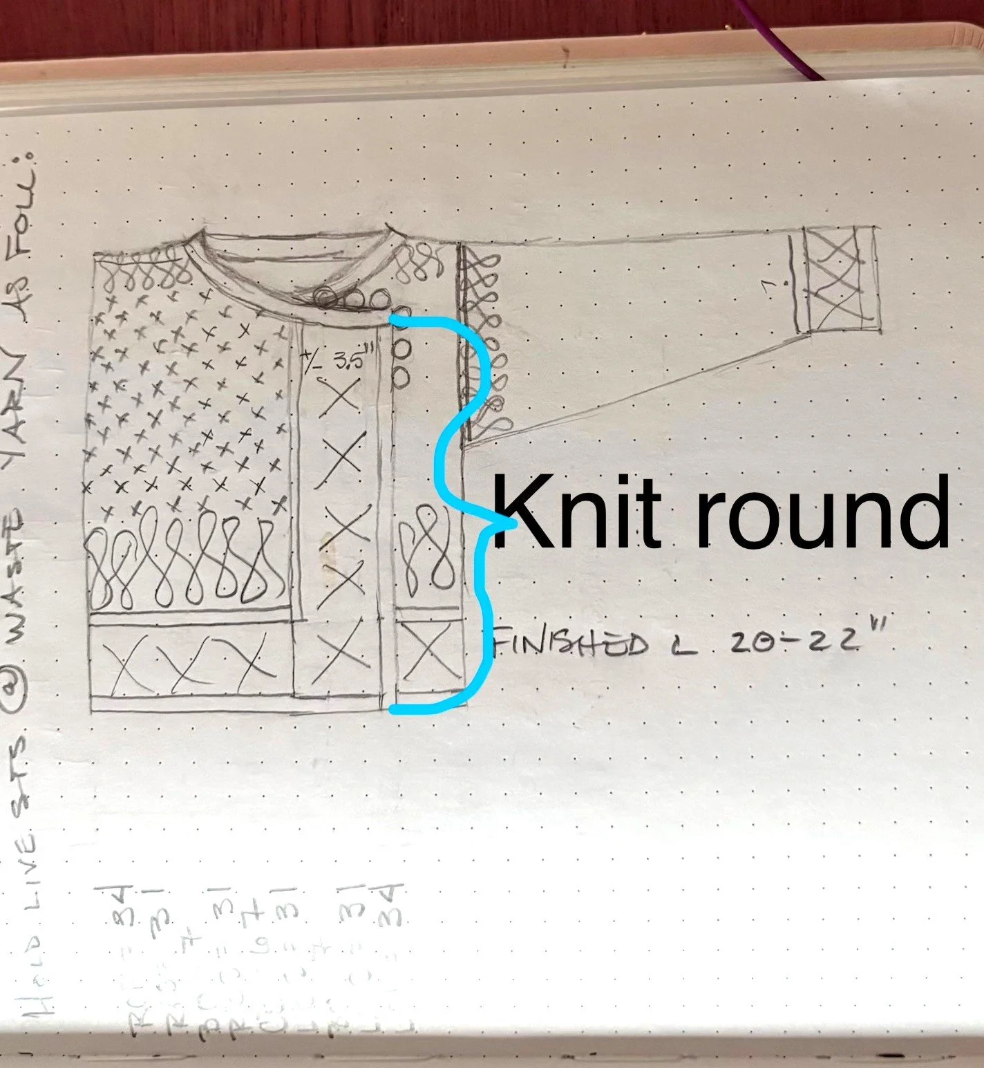 The rubber is starting to hit the road, here at Mary Elizabeth Scott Handknitter International Headquarters. As always, while I knit/design, I keep meticulous notes about what I’m doing, how I’m doing it, and what numbers are involved. Usually they are scary-looking, and unintelligeable to anyone but me. For example, the scribble below represents a cross-section of the sweater body tube, with the division of stitches called out for cutting. My loved ones refer to my notebook as evidence of a “beautiful mind”.