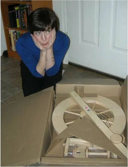 I never have spun on a wheel. Any wheel. I only last week managed my spindle. But true to form, I signed up for a class with the venerable Judith MacKenzie McCuin, hoping I can learn to make a continuous thread in time, and only then began casting about for a wheel to purchase. Turns out you're supposed to try out wheels before you buy one. Turns out there are all different kinds, and if you buy one without trying it first you might not like it. But how am I supposed to do that? There isn't anywhere to see wheels within 80 miles of my house. And if there were, wouldn't I be unequipped to judge equipment that I cannot operate? So just as with motorcycles and books in languages I cannot read and lots of other things I get excited to discover, I picked one that seems right, and that's the one I'll learn on. This reverse strategy has served me well in the past, so who am I to start questioning it now? Besides, as difficult as it is to get a wheel sometimes (whaddya mean, six-month wait?), I felt I should leap first and look later when this one presented itself. Thanks Morgaine!